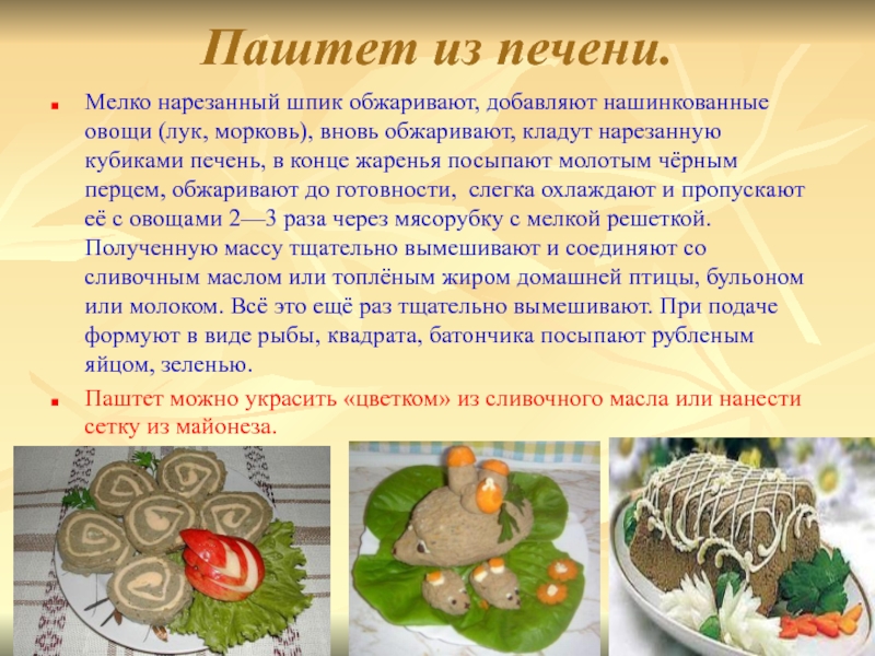 морковь), вновь обжаривают, кладут нарезанную кубиками печень, в конце жаренья посыпают молотым чёрным перцем, обжаривают до готовности, слегка охлаждают и пропускают её с овощами 2—3 раза через мясорубку с мелкой решеткой. Полученную массу тщательно вымешивают и соединяют со сливочным маслом или топлёным жиром домашней птицы, бульоном или молоком. Всё это ещё раз тщательно вымешивают. При подаче формуют в виде рыбы, квадрата, батончика посыпают рубленым яйцом, зеленью.