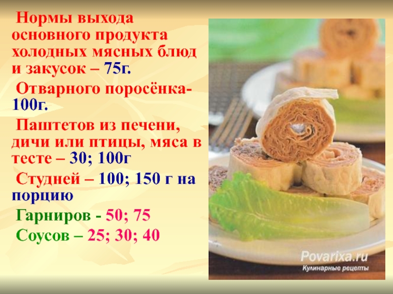 Слайд 57Нормы выхода основного продукта холодных мясных блюд и закусок – 75г.