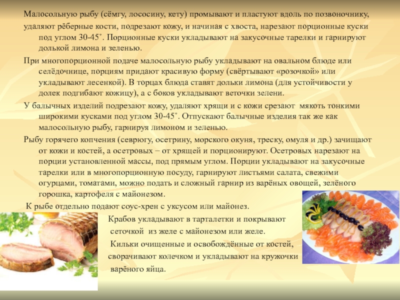 порцию и укладывают на блюдо. С правой стороны размещают гарнир из отварных моркови и картофеля, нарезанных кубиками, огурцов нарезанных кружочками, долек томатов и салата из краснокочанной капусты. В качестве гарнира используют так же мясное желе, мелко нарезанные маринованные фрукты, строганый хрен.