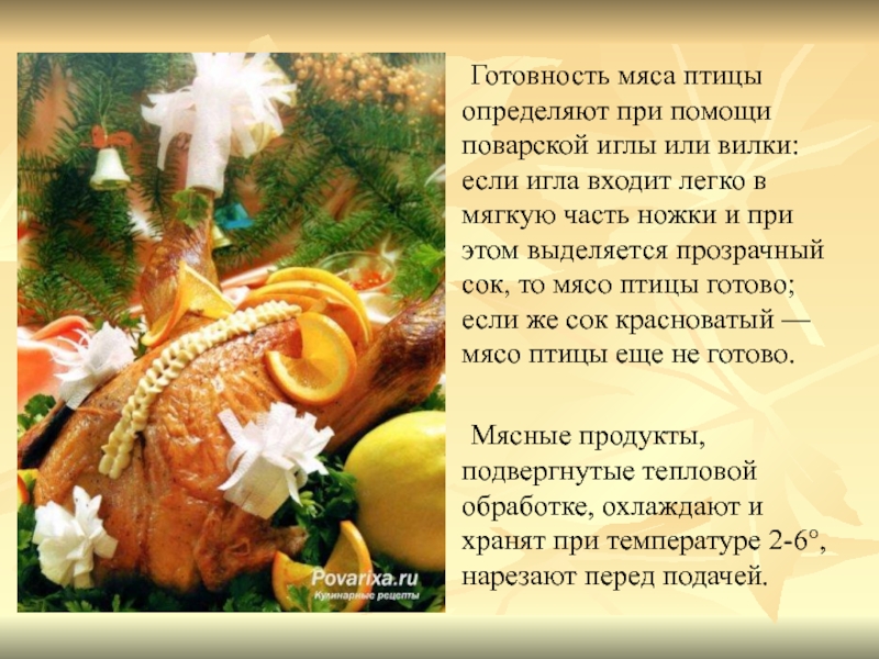 Слайд 21Готовность мяса птицы определяют при помощи поварской иглы или вилки: если