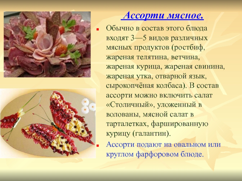 различных мясных продуктов (ростбиф, жареная телятина, ветчина, жареная курица, жареная свинина, жареная утка, отварной язык, сырокопчёная колбаса). В состав ассорти можно включить салат «Столичный», уложенный в волованы, мясной салат в тарталетках, фаршированную курицу (галантин).