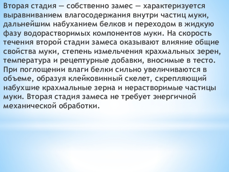 муки, дальнейшим набуханием белков и переходом в жидкую фазу водорастворимых компонентов муки. На скорость течения второй стадии замеса оказывают влияние общие свойства муки, степень измельчения крахмальных зерен, температура и рецептурные добавки, вносимые в тесто. При поглощении влаги белки сильно увеличиваются в объеме, образуя клейковинный скелет, скрепляющий набухшие крахмальные зерна и нерастворимые частицы муки. Вторая стадия замеса не требует энергичной механической обработки.
