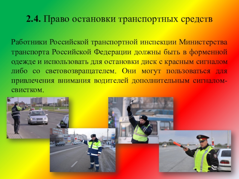 быть в форменной одежде и использовать для остановки диск с красным сигналом либо со световозвращателем. Они могут пользоваться для привлечения внимания водителей дополнительным сигналом-свистком.
