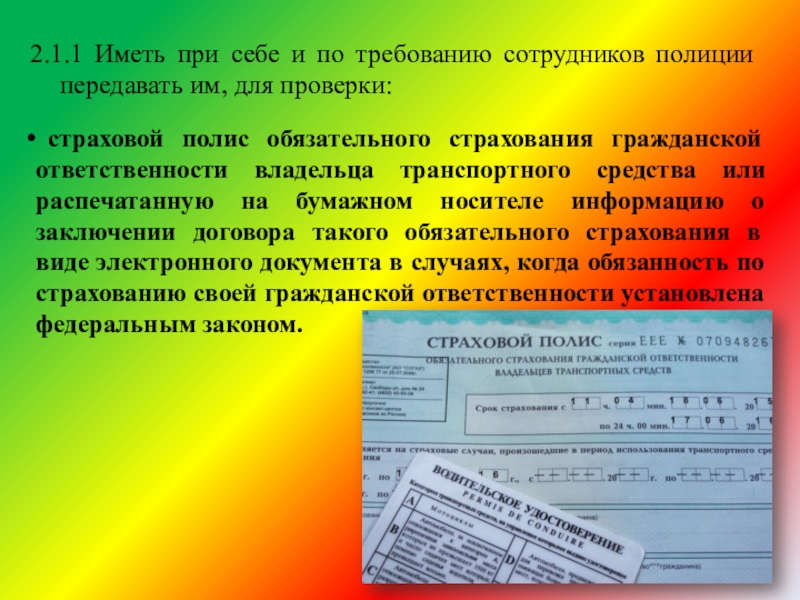Слайд 10 страховой полис обязательного страхования гражданской ответственности владельца транспортного средства или