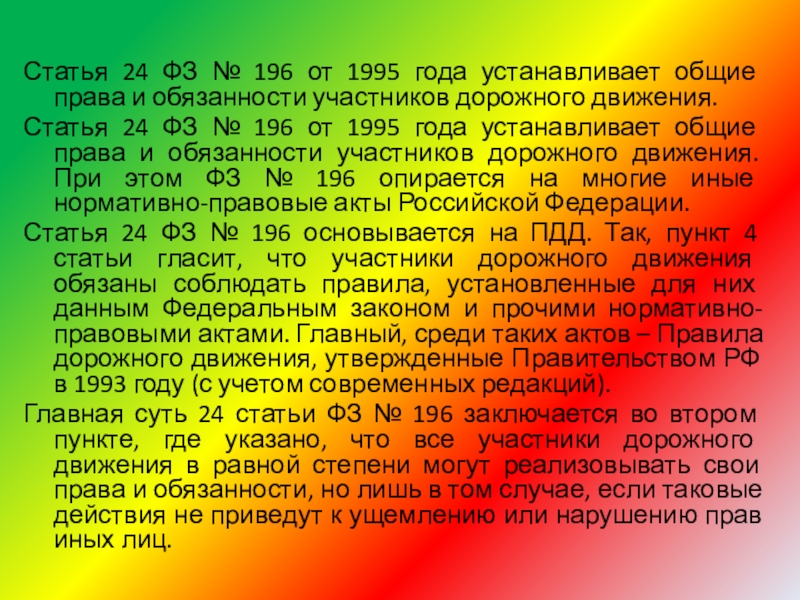 Слайд 6Статья 24 ФЗ № 196 от 1995 года устанавливает общие права