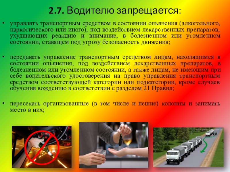 передавать управление транспортным средством лицам, находящимся в состоянии опьянения, под воздействием лекарственных препаратов, в болезненном или утомленном состоянии, а также лицам, не имеющим при себе водительского удостоверения на право управления транспортным средством соответствующей категории или подкатегории, кроме случаев обучения вождению в соответствии с разделом 21 Правил;