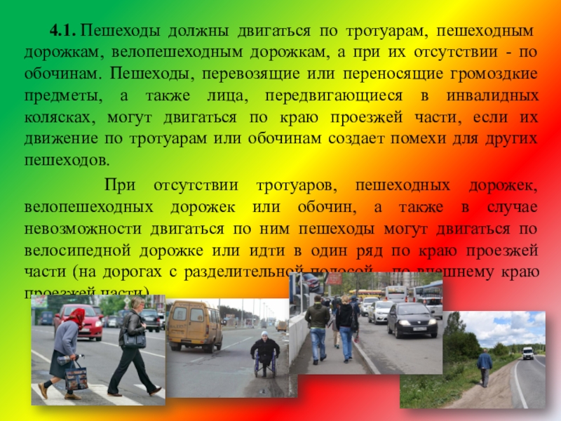 Слайд 29 4.1. Пешеходы должны двигаться по тротуарам, пешеходным дорожкам, велопешеходным