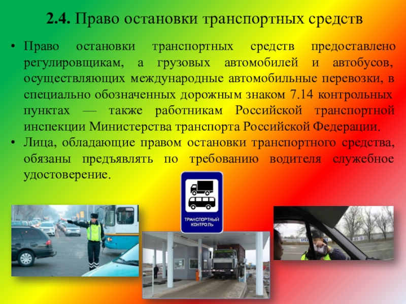 грузовых автомобилей и автобусов, осуществляющих международные автомобильные перевозки, в специально обозначенных дорожным знаком 7.14 контрольных пунктах — также работникам Российской транспортной инспекции Министерства транспорта Российской Федерации.