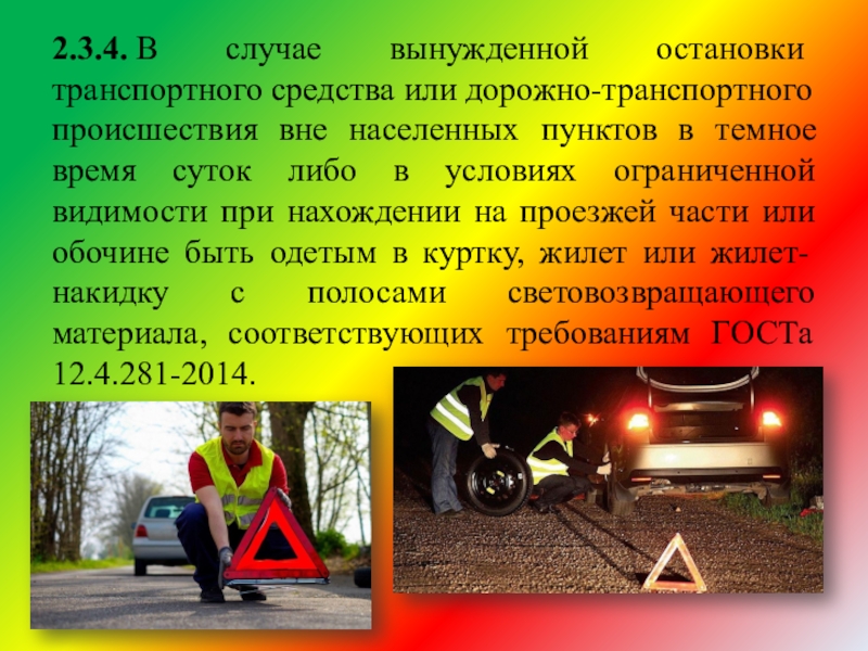 Слайд 182.3.4. В случае вынужденной остановки транспортного средства или дорожно-транспортного происшествия вне населенных