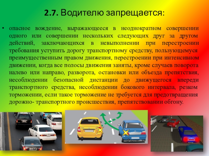 Слайд 27опасное вождение, выражающееся в неоднократном совершении одного или совершении нескольких следующих