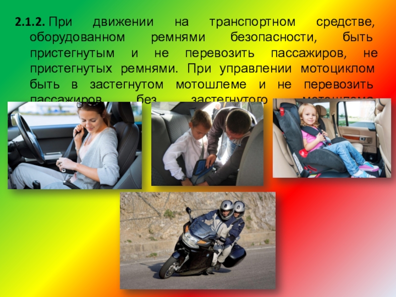 Слайд 112.1.2. При движении на транспортном средстве, оборудованном ремнями безопасности, быть пристегнутым и