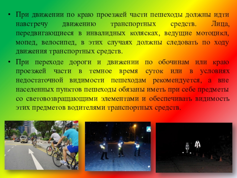 транспортных средств. Лица, передвигающиеся в инвалидных колясках, ведущие мотоцикл, мопед, велосипед, в этих случаях должны следовать по ходу движения транспортных средств.