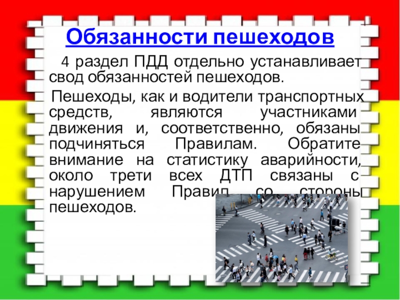 Пешеходы, как и водители транспортных средств, являются участниками движения и, соответственно, обязаны подчиняться Правилам. Обратите внимание на статистику аварийности, около трети всех ДТП связаны с нарушением Правил со стороны пешеходов.