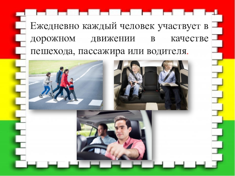 Слайд 3 Ежедневно каждый человек участвует в дорожном движении в качестве