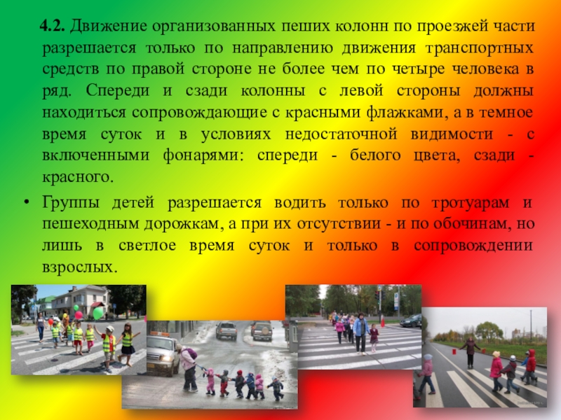 Слайд 31 4.2. Движение организованных пеших колонн по проезжей части разрешается только