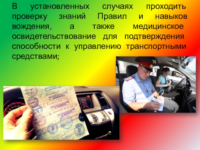 Слайд 15В установленных случаях проходить проверку знаний Правил и навыков вождения, а