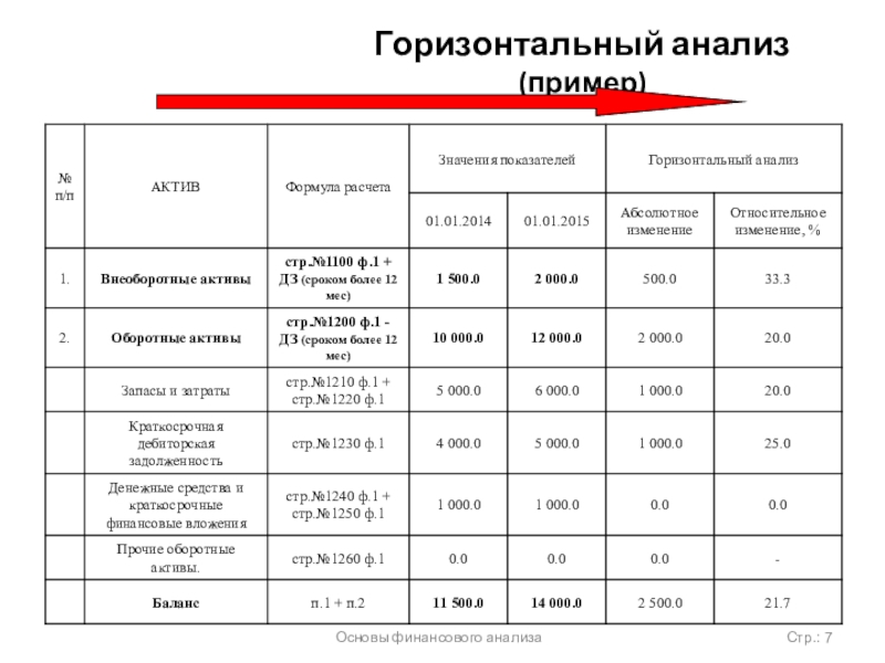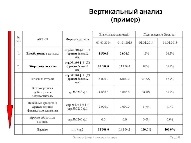 Вертикальный (структурный) анализ - определение структуры итоговых финансовых показателей с выявлением влияния каждой позиции отчетности на результат в целом;