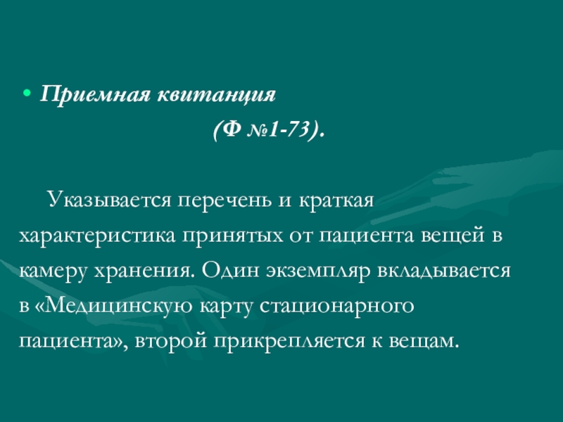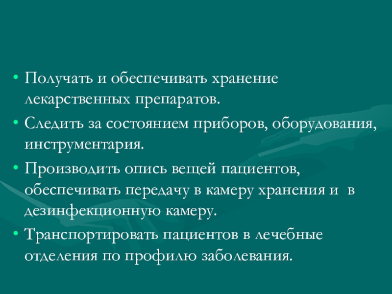 опись вещей пациентов, обеспечивать передачу в камеру хранения и в дезинфекционную камеру.
