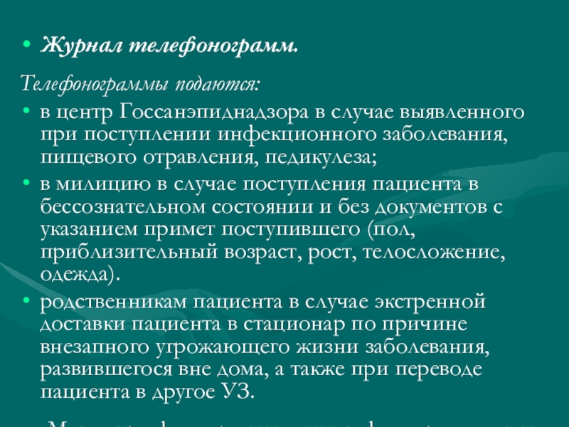 Производить телефонограммы в полицию, центр Госсанэпиднадзора, отправку экстренных извещений в центр Госсанэпиднадзора.