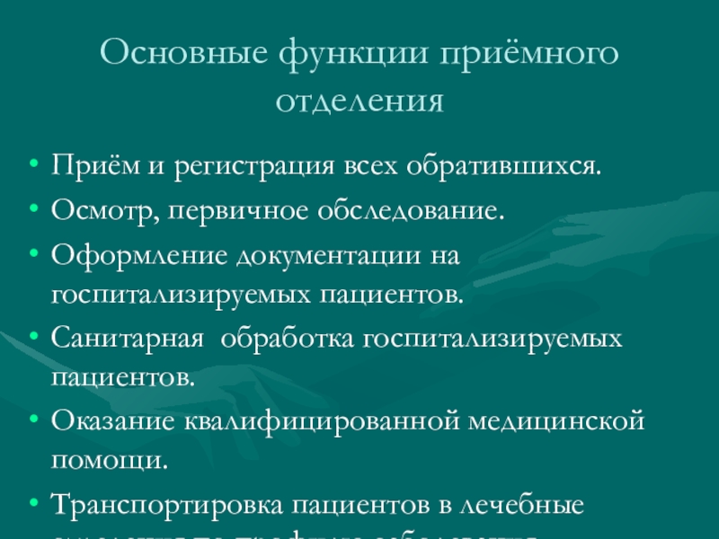 Транспортировка пациентов в лечебные отделения по профилю заболевания.