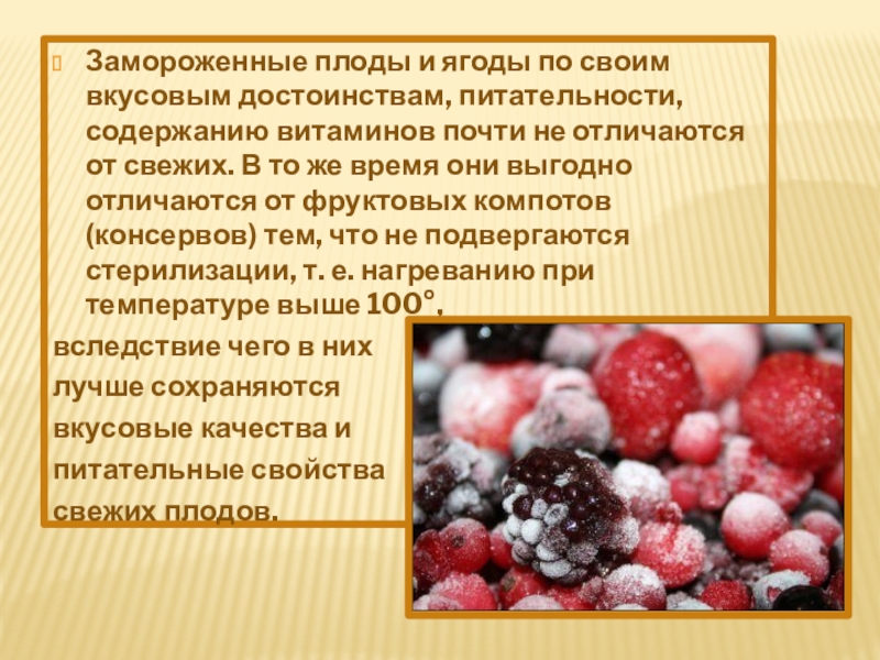 Слайд 11Замороженные плоды и ягоды по своим вкусовым достоинствам, питательности, содержанию витаминов
