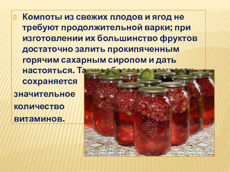 Слайд 8Компоты из свежих плодов и ягод не требуют продолжительной варки; при
