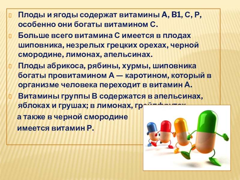 Слайд 6Плоды и ягоды содержат витамины A, B1, С, Р, особенно они