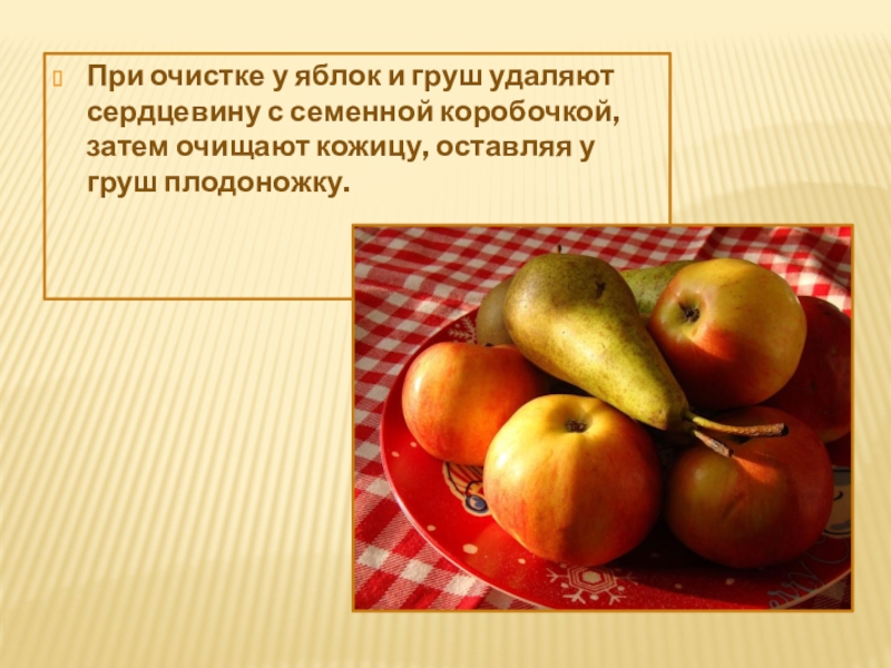 Слайд 15При очистке у яблок и груш удаляют сердцевину с семенной коробочкой,