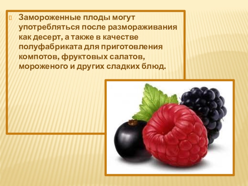 Слайд 12Замороженные плоды могут употребляться после размораживания как десерт, а также в