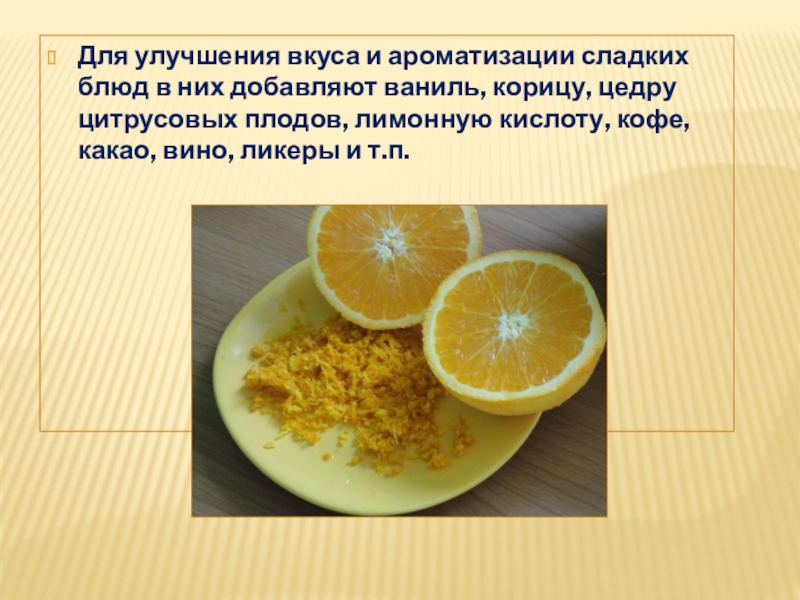 Слайд 3Для улучшения вкуса и ароматизации сладких блюд в них добавляют ваниль,