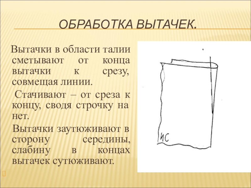 ОБРАБОТКА ВЫТАЧЕК. Вытачки в области талии сметывают от конца вытачки к срезу, совмещая линии. Стачивают – от среза к концу, сводя строчку на нет. Вытачки заутюживают в сторону середины, слабину в концах вытачек