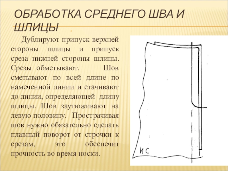 стороны шлицы и припуск среза нижней стороны шлицы. Срезы обметывают. Шов сметывают по всей длине по намеченной линии и стачивают до линии, определяющей длину шлицы. Шов заутюживают на левую половину. Прострачивая шов нужно обязательно сделать плавный поворот от строчки к срезам, это обеспечит прочность во время носки.