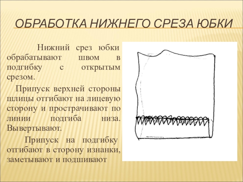 ОБРАБОТКА НИЖНЕГО СРЕЗА ЮБКИ    Нижний срез юбки обрабатывают швом в подгибку с открытым срезом.