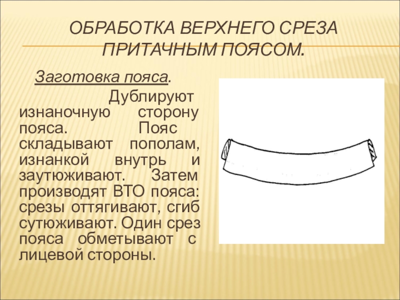 пояса. Пояс складывают пополам, изнанкой внутрь и заутюживают. Затем производят ВТО пояса: срезы оттягивают, сгиб сутюживают. Один срез пояса обметывают с лицевой стороны.