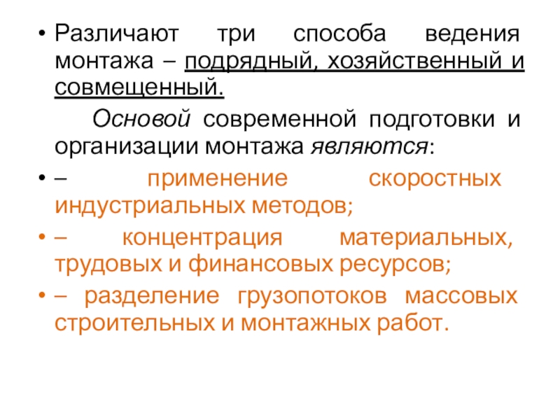 Слайд 17Различают три способа ведения монтажа – подрядный, хозяйственный и совмещенный.
