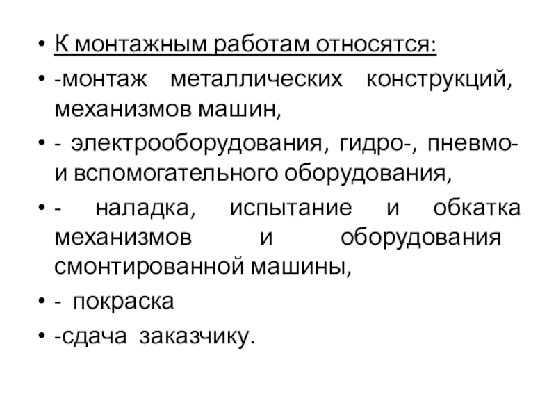 - наладка, испытание и обкатка механизмов и оборудования смонтированной машины,