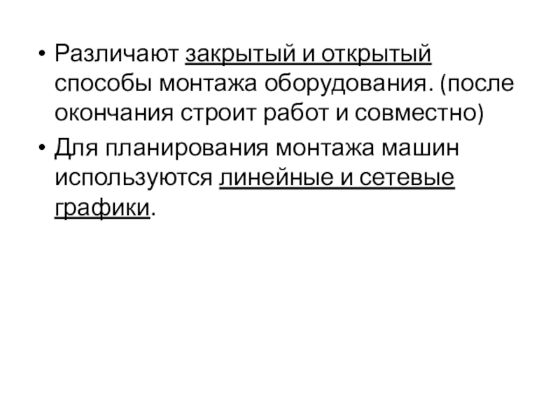 Слайд 18Различают закрытый и открытый способы монтажа оборудования. (после окончания строит работ