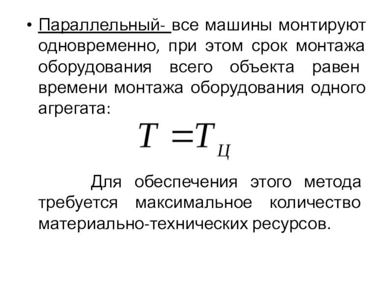 Слайд 27Параллельный- все машины монтируют одновременно, при этом срок монтажа оборудования всего