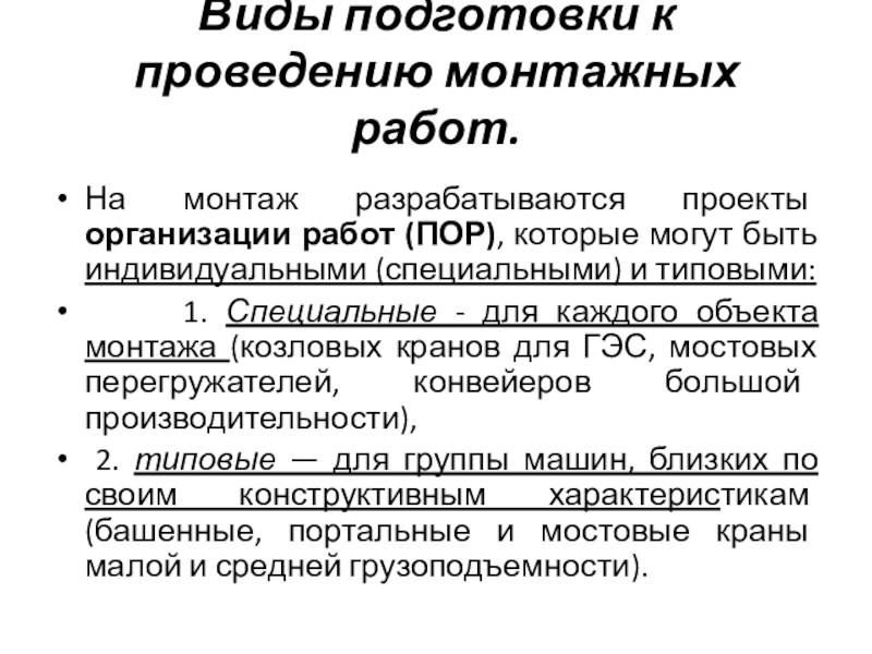 1. Специальные - для каждого объекта монтажа (козловых кранов для ГЭС, мостовых перегружателей, конвейеров большой производительности),