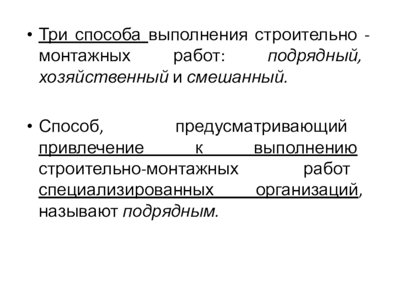 Слайд 7Три способа выполнения строительно - монтажных работ: подрядный, хозяйственный и смешанный.