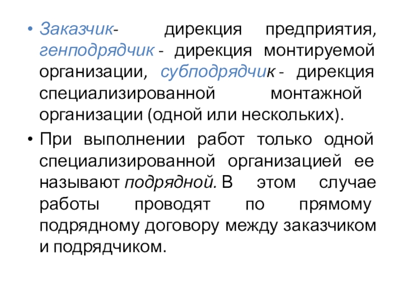 Слайд 10Заказчик- дирекция предприятия, генподрядчик - дирекция монтируемой организации, субподрядчик - дирекция специализированной монтажной