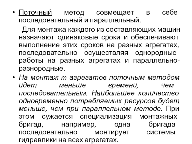 На монтаж m агрегатов поточным методом идет меньше времени, чем последовательным. Наибольшее количество одновременно потребляемых ресурсов будет меньше, чем при параллельном методе. При этом сужается специализация монтажных бригад, например, одна бригада последовательно монтирует системы гидравлики на всех агрегатах.