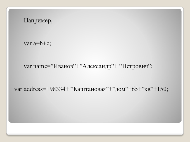 var name=”Иванов”+”Александр”+ ”Петрович”;