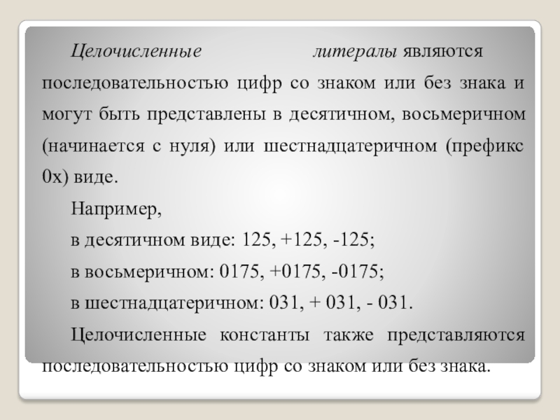 Слайд 11Целочисленные литералы являются последовательностью цифр со знаком или без знака и могут