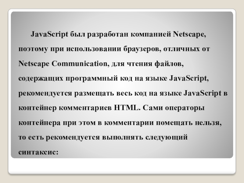 Netscape Communication, для чтения файлов, содержащих программный код на языке JavaScript, рекомендуется размещать весь код на языке JavaScript в контейнер комментариев HTML. Сами операторы контейнера при этом в комментарии помещать нельзя, то есть рекомендуется выполнять следующий синтаксис: