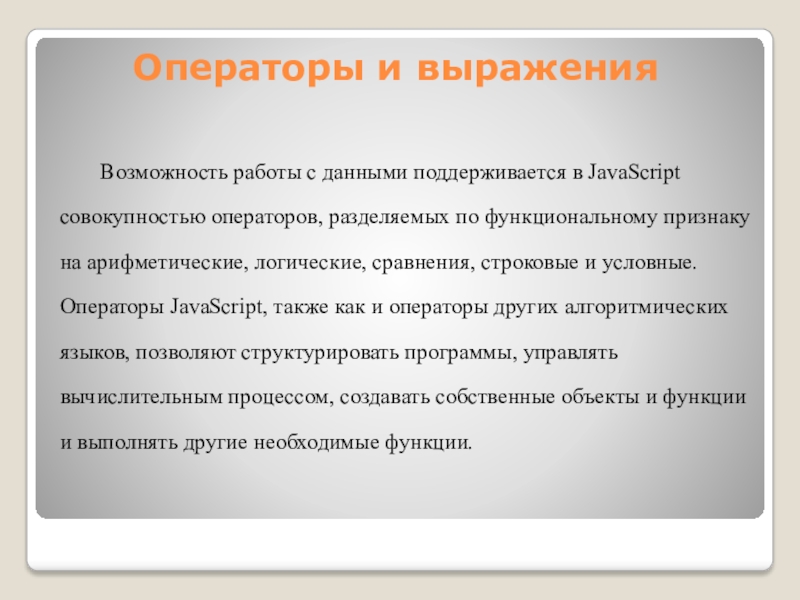 по функциональному признаку на арифметические, логические, сравнения, строковые и условные. Операторы JavaScript, также как и операторы других алгоритмических языков, позволяют структурировать программы, управлять вычислительным процессом, создавать собственные объекты и функции и выполнять другие необходимые функции.