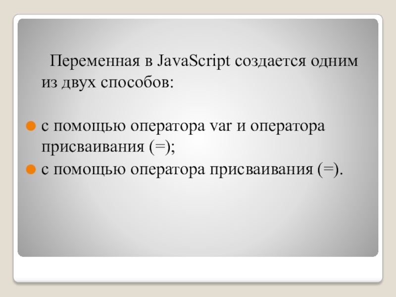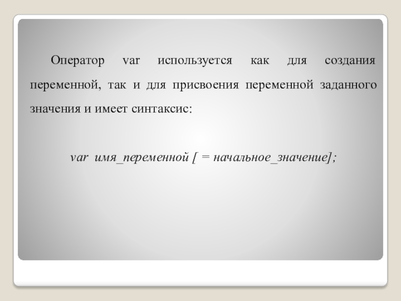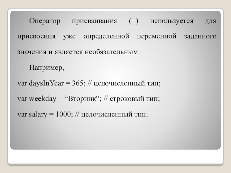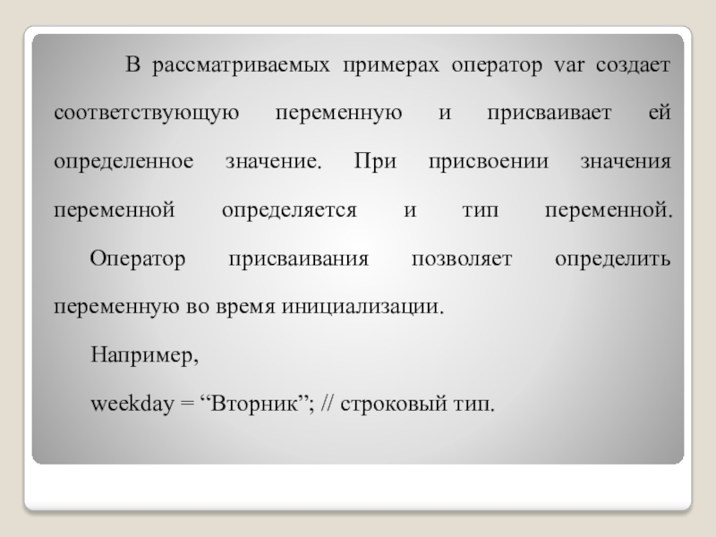 Слайд 18 В рассматриваемых примерах оператор var создает соответствующую переменную и присваивает ей
