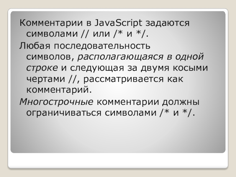 Слайд 7Комментарии в JavaScript задаются символами // или /* и */.