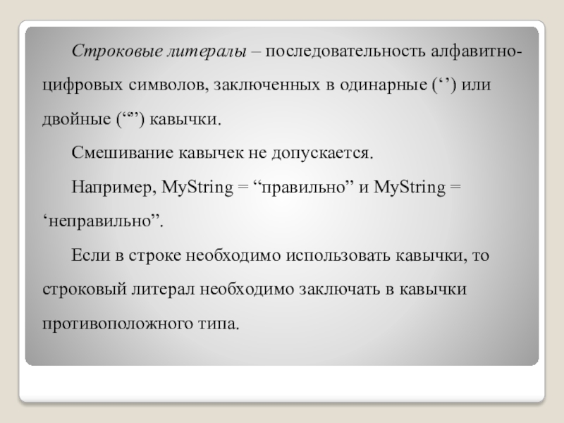 Слайд 13Строковые литералы – последовательность алфавитно-цифровых символов, заключенных в одинарные (‘’) или двойные