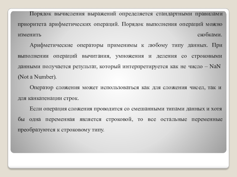 Арифметические операторы применимы к любому типу данных. При выполнении операций вычитания, умножения и деления со строковыми данными получается результат, который интерпретируется как не число – NaN (Not a Number).